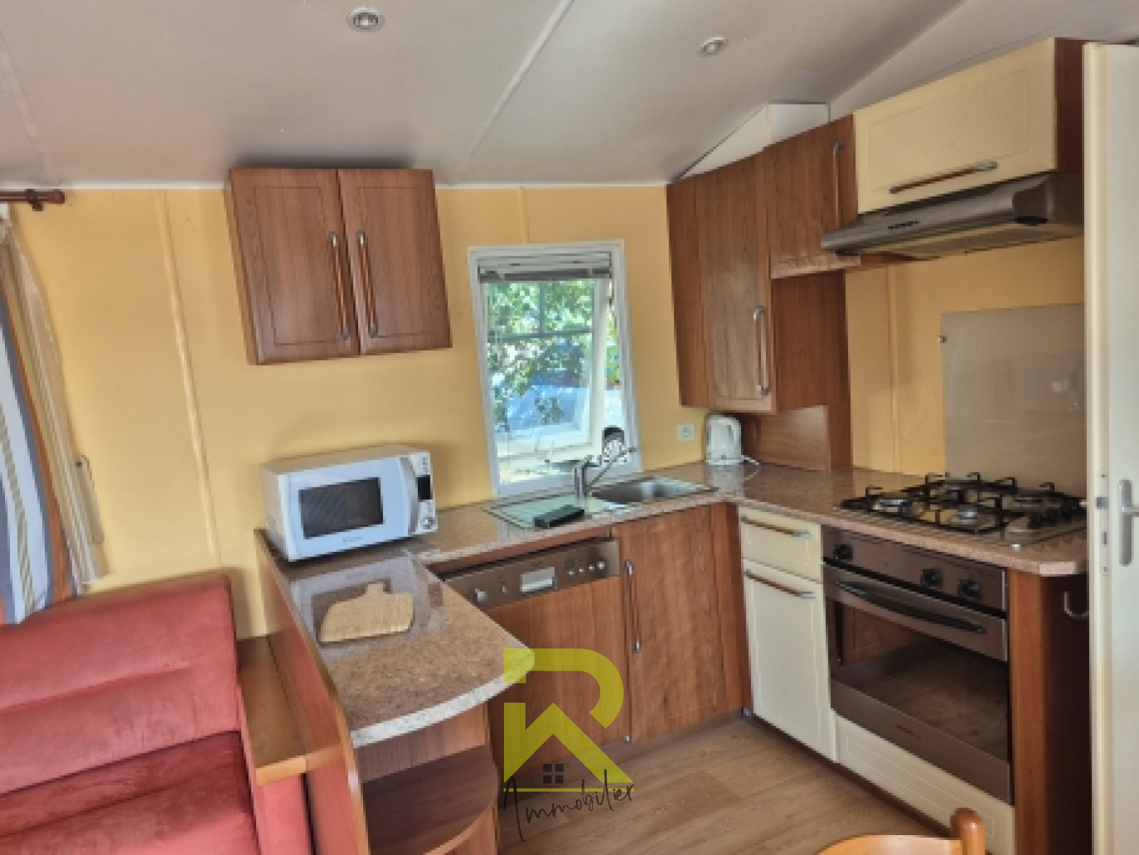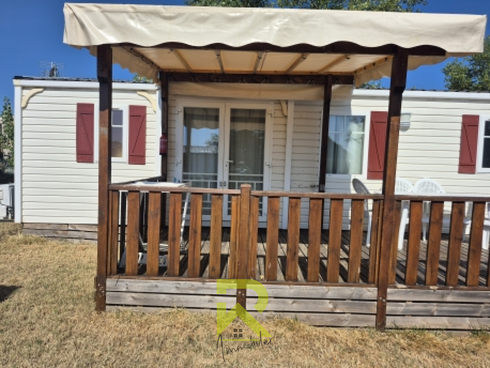 mobil home irm rubis 2 chambres sdb wc 9 m x 4 m avec terrasse de 6.50 m x 2.50 m semi couverte double vitrage et clim réversible équipée frigo/congélateur, machine a laver, lave vaisselle, four encastrable, plaque 4 feux, micro onde, hotte, ...